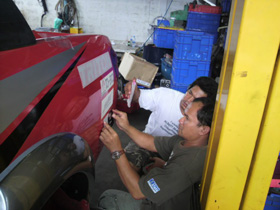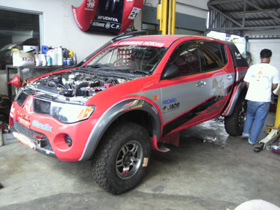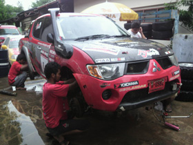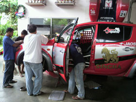 タイのメカの方と共に過ごす時間はとても新鮮です。また作業は真剣ですが、時に冗談で明るく愉快なチームです。またいつも関心するのは今まで参戦して残った備品などを大切に保管し、それを自慢してくれることです。これがほんとびっくりしてすごく感動します。 ゼッケンもバッチリ貼り終えました。ここまでくるのに道のり長かった。
